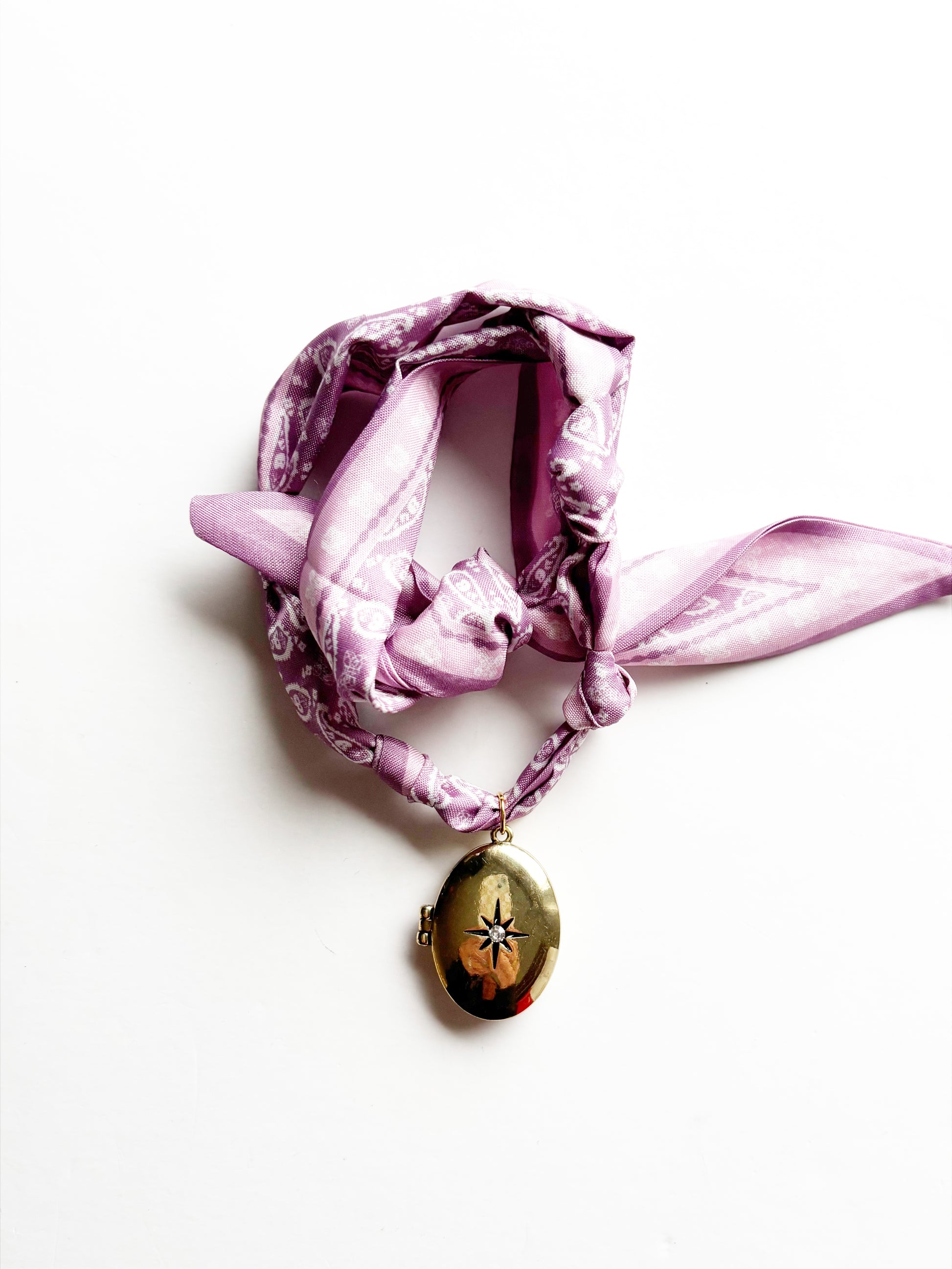 The cutest silk necklace, made with a beautiful starburst locket and ties on for comfort! Also adorable tied onto your favorite purse or tote! Each necklace can be worn at 15inch up to 19 inch.